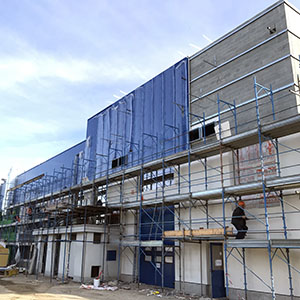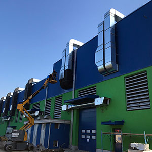 Interessante è vedere la soluzione di abbinamento tra una facciata metallica realizzata con un pannello STAR blu cobalto e la parte bassa realizzata con un cappotto tradizionale intonacato di colore verde. Ma anche al suo interno, l'intervento ha delle soluzioni interessanti, per esempio, il controsoffitto realizzato con pannelli in lana minerale Lithos 5 da 100 mm versione REI, posizionata al di sotto degli “shed” (che per chi non lo sapesse sono le travature dalla forma a sega tipiche degli edifici industriali di epoche passate).